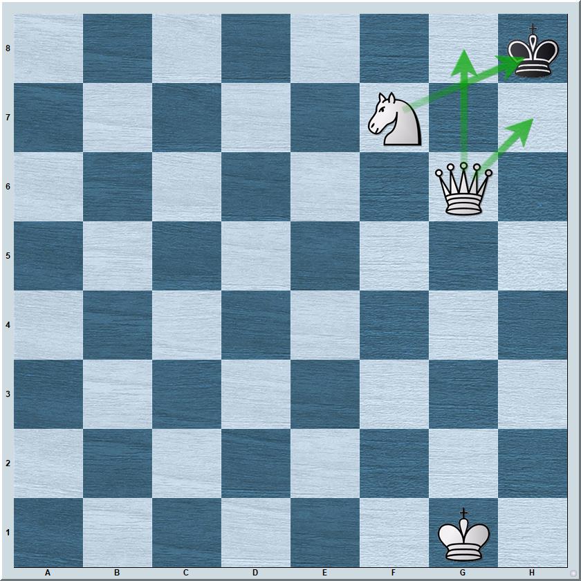 This makes it impossible for the enemy king to capture the Knight or the Rook. The remaining escape square is blocked by the enemy King’s allied pawn.
